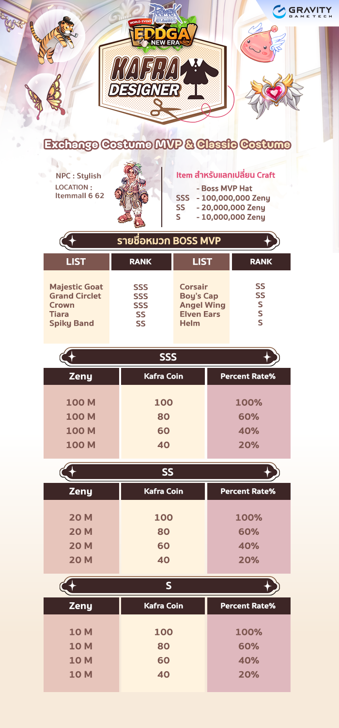 - Kafra Coin สามารถนำไป คราฟหมวกระดับ S-SSS ได้ ที่ NPC : Stylish พิกัด Itemmall