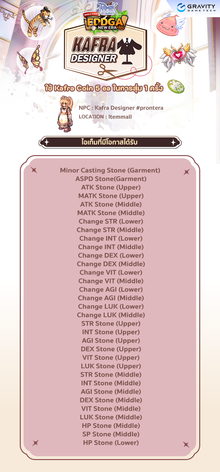 - เมื่อหมดระยะเวลา Kafra Designer จะมีการเปลี่ยนแปลงรายการคอสตูมที่รับออกแบบ
