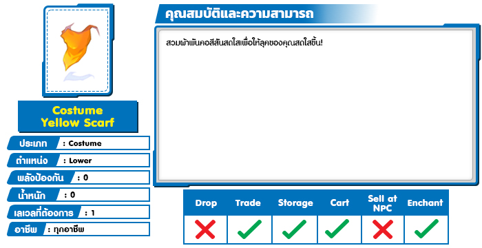 - Costume: Yellow Scarf วัตถุที่ใช้