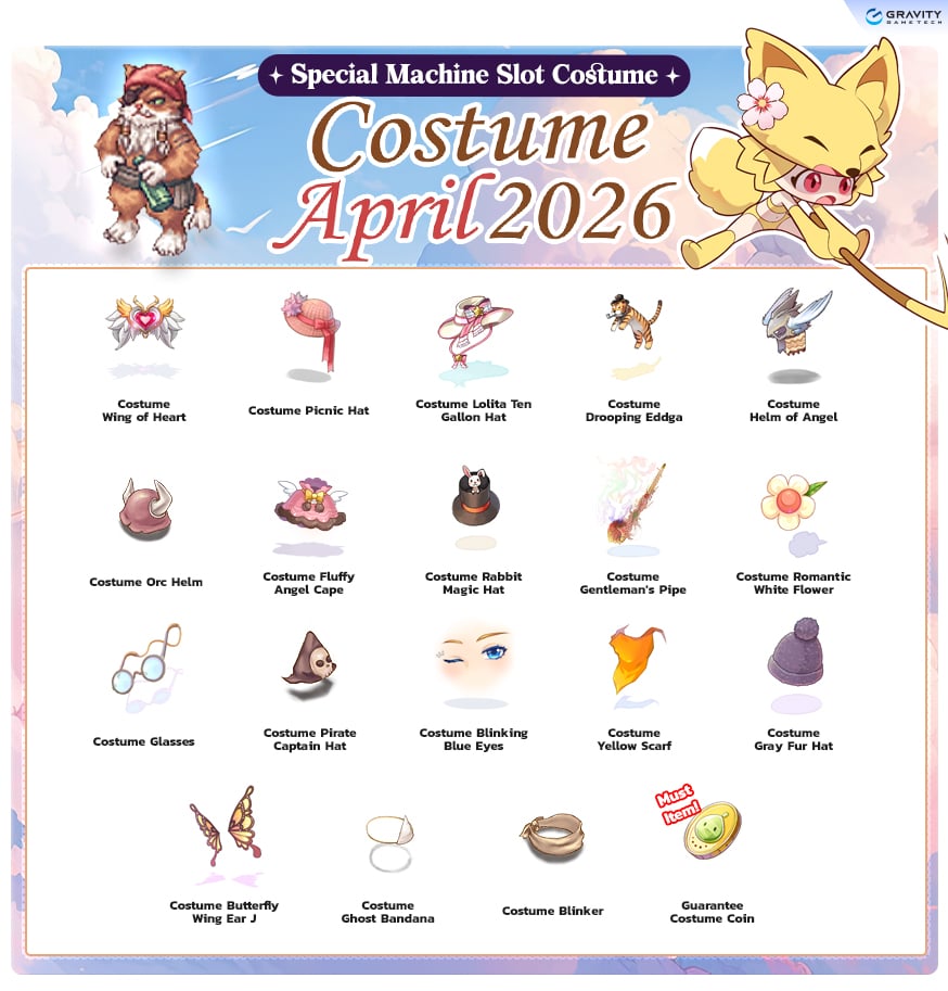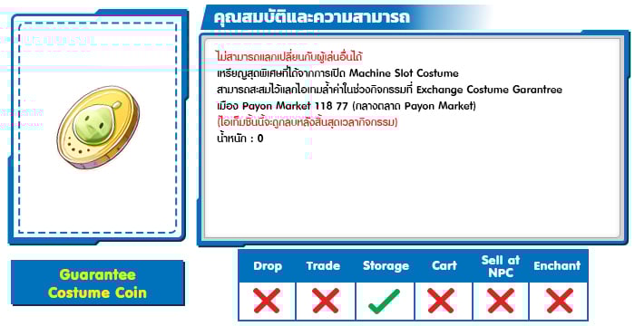 - ผู้เล่นสามารถสะสม Guarantee Costume Coin จากการเปิด Machine Slot Costume ตามจำนวนที่กำหนดมาแลกเป็นไอเทมในร้านค้า Mystery Shop (พิกัด pay_mk 118 77) ได้