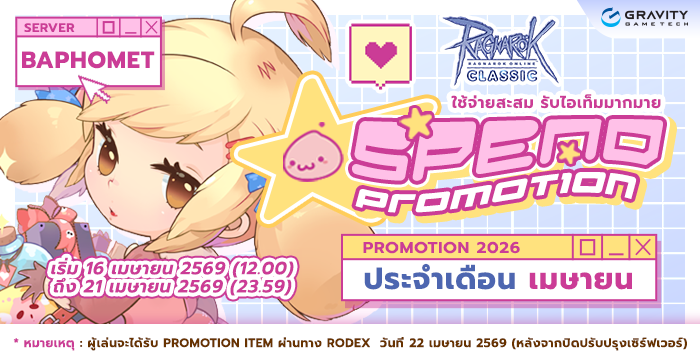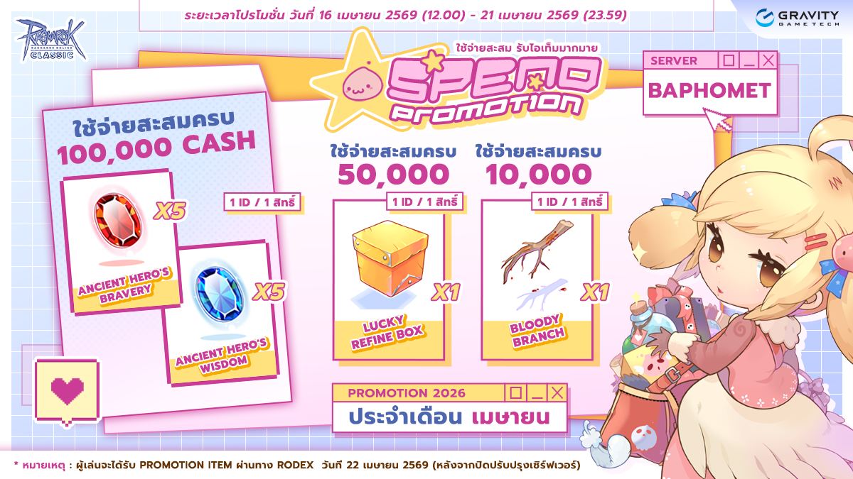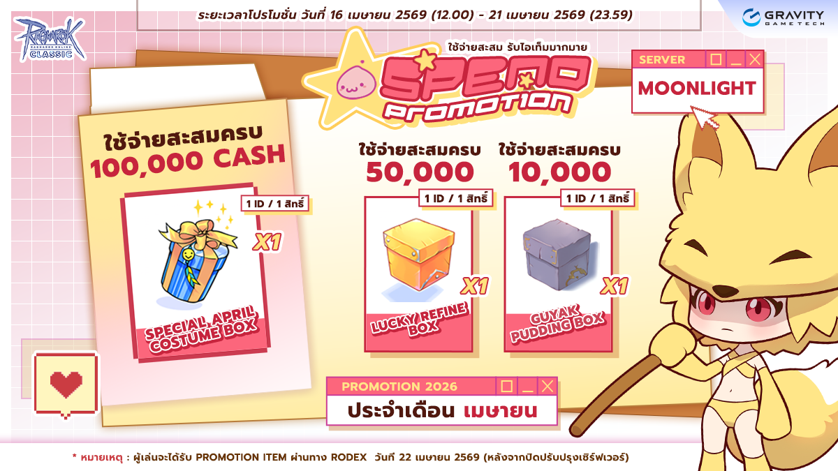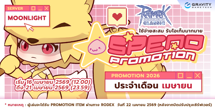 ( 1 ไอดี สามารถเข้าร่วมโปรโมชั่นได้สูงสุด 1 สิทธิ์ ) - ผู้เล่นจะได้รับ Promotion Item ผ่านทาง Rodex ใน วันที่ 22 เมษายน 2569 (หลังปิดปรับปรุง Server ประจำสัปดาห์)